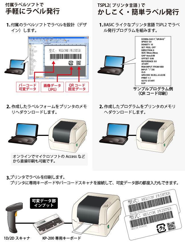 プリンタのメモリに付属のラベルデザインソフトで作成したラベルフォームや、BASICライクなプリンタ言語TSPL2で作成したプログラムをプリンタにダウンロードしておけば、バーコードスキャナやKP-200キーボード(オプション)で可変データ部を都度入力できるので、フレキシブルなラベル発行が可能です。