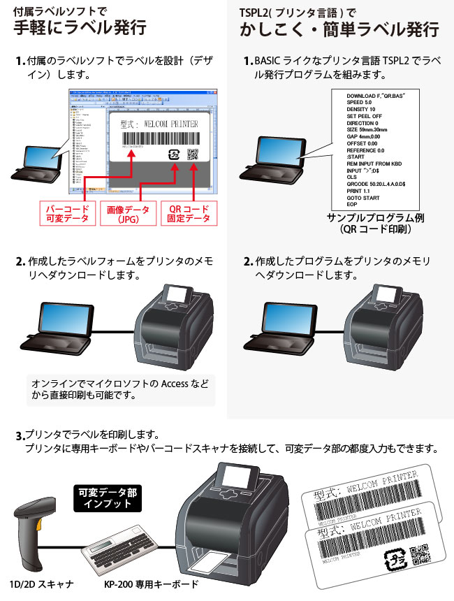 プリンタのメモリに付属のラベルデザインソフトで作成したラベルフォームや、BASICライクなプリンタ言語TSPL2で作成したプログラムをプリンタにダウンロードしておけば、バーコードスキャナやKP-200キーボード(オプション)で可変データ部を都度入力できるので、フレキシブルなラベル発行が可能です。