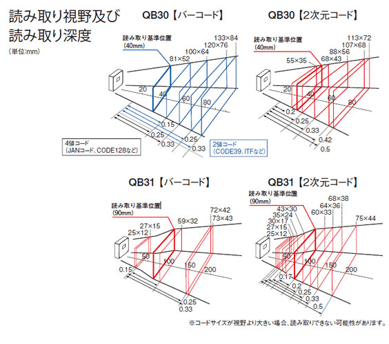 | (*2) | 外部トリガ使用時、読み取り基準位置においてセルサイズ:0.33mm/Ver5のQRコード1個を読み取った場合の参考値であり、実際の環境条件により変化します。 |