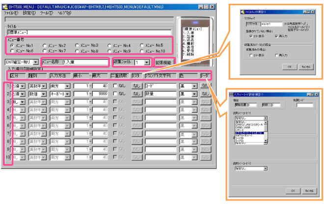 | メニュー番号 | 業務メニュー10個迄定義可能(操作メニュー 送信・受信など可) | |