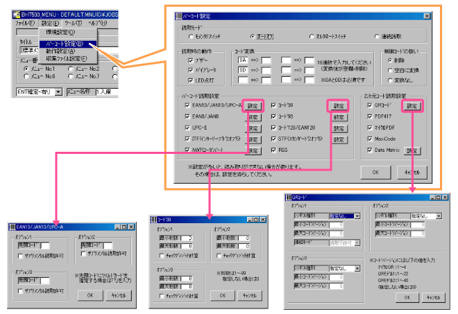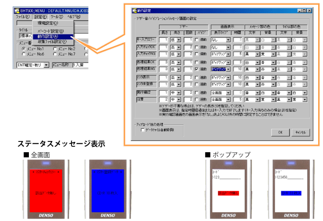 付属のメニューソフトでバーコード読み取り条件やステータスメッセージ表示色をカスタマイズできます。